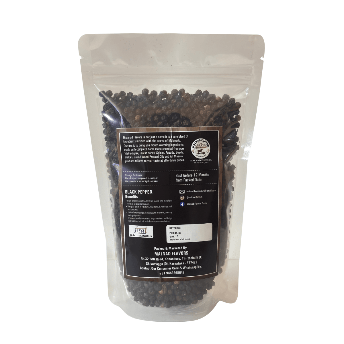 Malnad Black Pepper is a high-quality spice cultivated in the lush Western Ghats of the Malnad region in Karnataka. Grown under natural shade and harvested at the right maturity, the peppercorns are carefully sun-dried to retain their strong aroma and bold, pungent flavor. Known for its rich essential oils and distinctive heat, Malnad Black Pepper is widely used in traditional cooking, spice blends, and herbal preparations. It reflects the purity and authentic taste of Malnad’s spice heritage.
