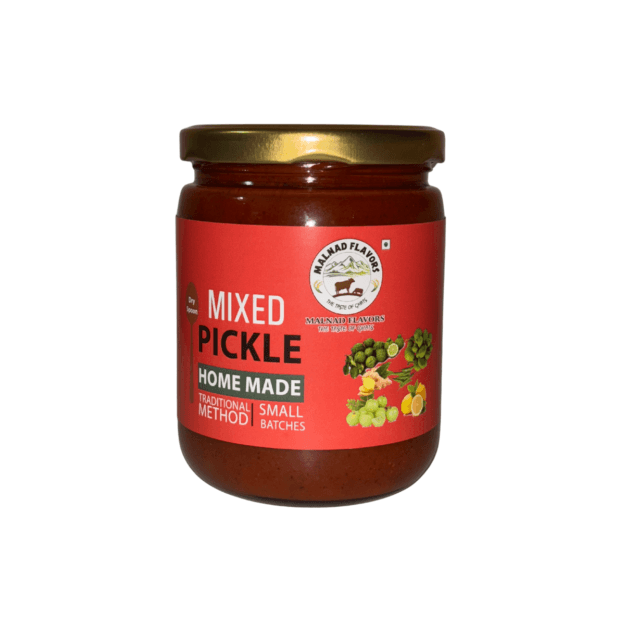 Malnad Mixed Pickle is a traditional, homemade delicacy from the Malnad region of Karnataka, known for its bold, rustic flavors. It is prepared by blending a variety of locally grown vegetables and fruits—such as raw mango, lemon, gooseberry, bitter orange, and seasonal produce—with aromatic spices, cold-pressed oil, and natural salt. Slow curing enhances its tangy, spicy, and slightly bitter notes, creating a perfectly balanced pickle that pairs beautifully with rice, dosa, idli, and curd meals. Made without artificial preservatives, Malnad Mixed Pickle reflects the authentic taste and heritage of Malnad kitchens. 🌶️🥭