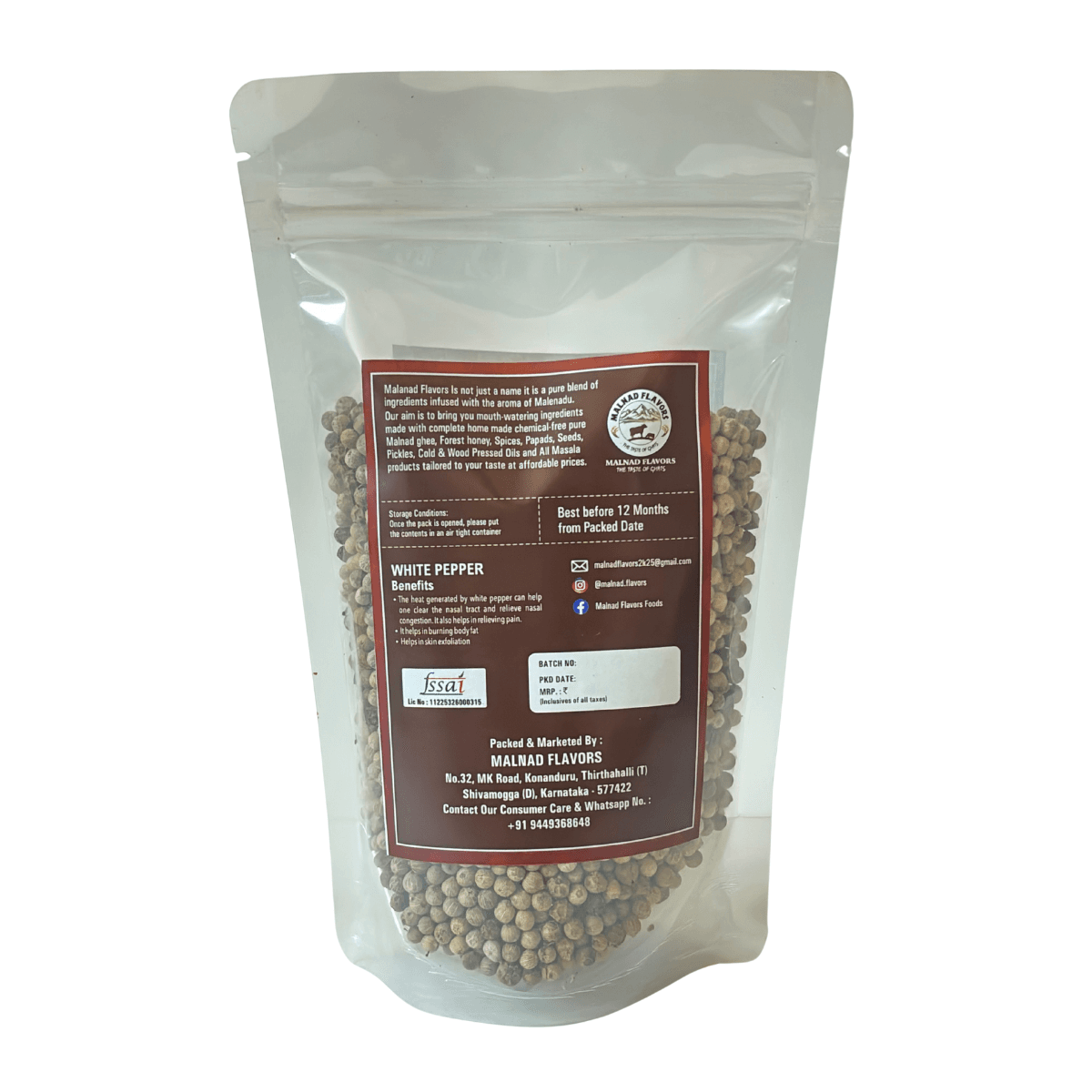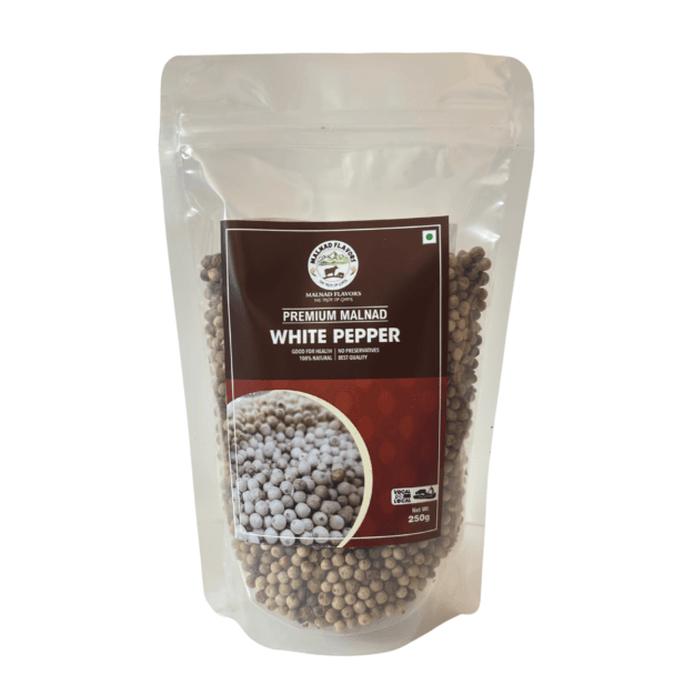 Malnad White Pepper is a high-quality spice from the Malnad region of Karnataka, produced from fully ripened pepper berries after removing the outer black skin. This process gives the pepper a cleaner appearance, milder aroma, and smooth yet sharp pungency. Carefully dried and processed using traditional methods, Malnad White Pepper is ideal for use in light-colored dishes, soups, sauces, and traditional recipes where a refined pepper flavor is desired. It reflects the purity and rich spice heritage of the Malnad region.
